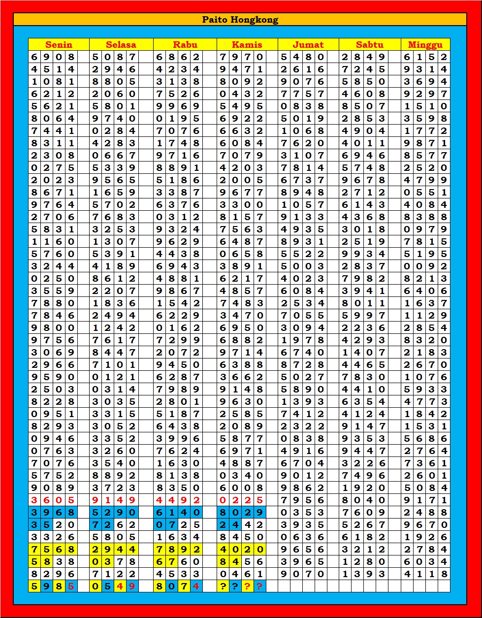 MASTER HONGKONG Senin, 10-11-2025 Merupakan Prediksi Otomatis yang menggabungkan Metode Kalender Togel Dengan Rumus-rumus kontrol yang sudah terbukti keakuratanya.Gunakan Aplikasi Rekap untuk mendapatkan LN TOP. Harap Maklum Jika kadang meleset MASTER HONGKONG kita. Jadikan ini sebagai perbandingan saja dan tetap UPS