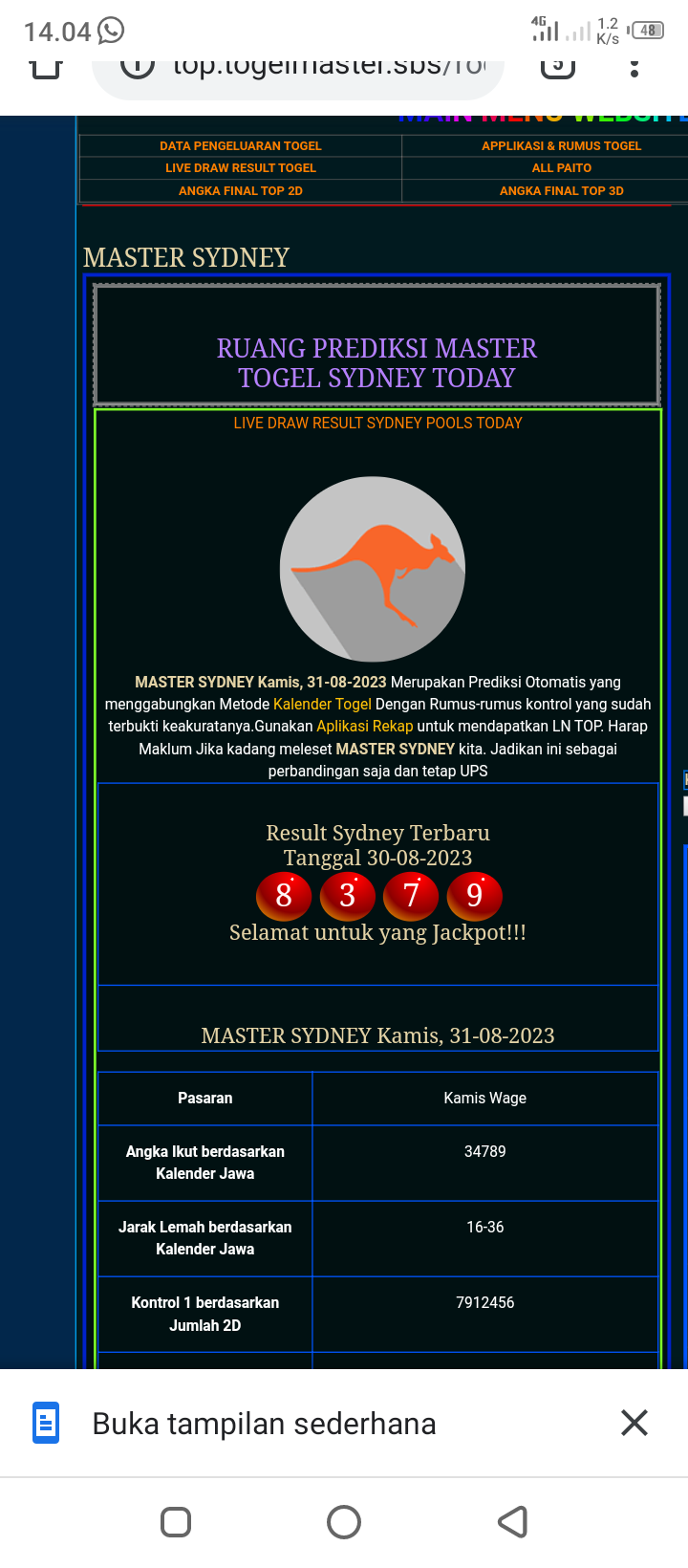 MASTER SYDNEY Rabu, 17-12-2025 Merupakan Prediksi Otomatis yang menggabungkan Metode Kalender Togel Dengan Rumus-rumus kontrol yang sudah terbukti keakuratanya.Gunakan Aplikasi Rekap untuk mendapatkan LN TOP. Harap Maklum Jika kadang meleset MASTER SYDNEY kita. Jadikan ini sebagai perbandingan saja dan tetap UPS