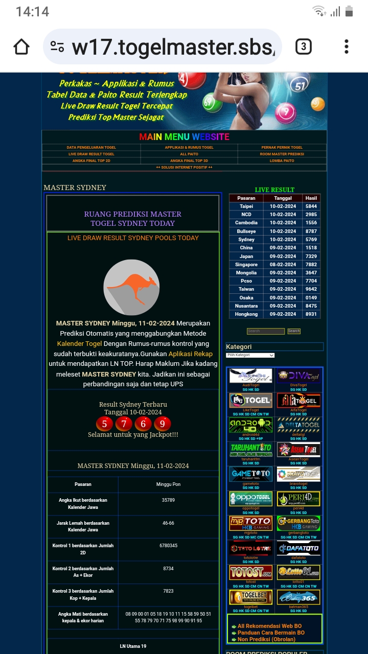 MASTER SYDNEY Rabu, 10-12-2025 Merupakan Prediksi Otomatis yang menggabungkan Metode Kalender Togel Dengan Rumus-rumus kontrol yang sudah terbukti keakuratanya.Gunakan Aplikasi Rekap untuk mendapatkan LN TOP. Harap Maklum Jika kadang meleset MASTER SYDNEY kita. Jadikan ini sebagai perbandingan saja dan tetap UPS