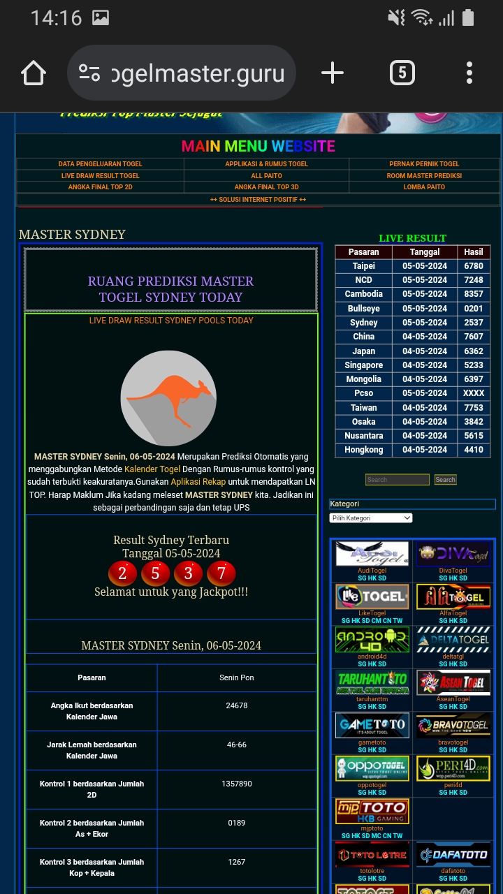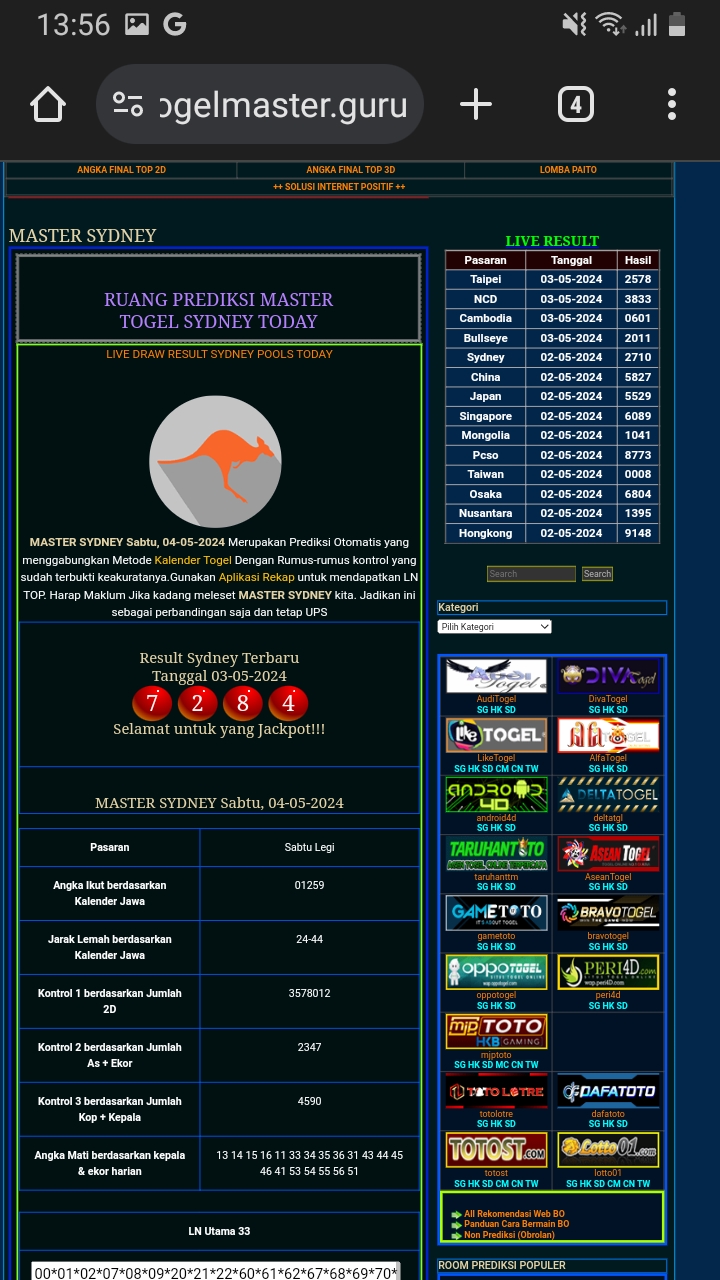 MASTER SYDNEY Rabu, 26-11-2025 Merupakan Prediksi Otomatis yang menggabungkan Metode Kalender Togel Dengan Rumus-rumus kontrol yang sudah terbukti keakuratanya.Gunakan Aplikasi Rekap untuk mendapatkan LN TOP. Harap Maklum Jika kadang meleset MASTER SYDNEY kita. Jadikan ini sebagai perbandingan saja dan tetap UPS