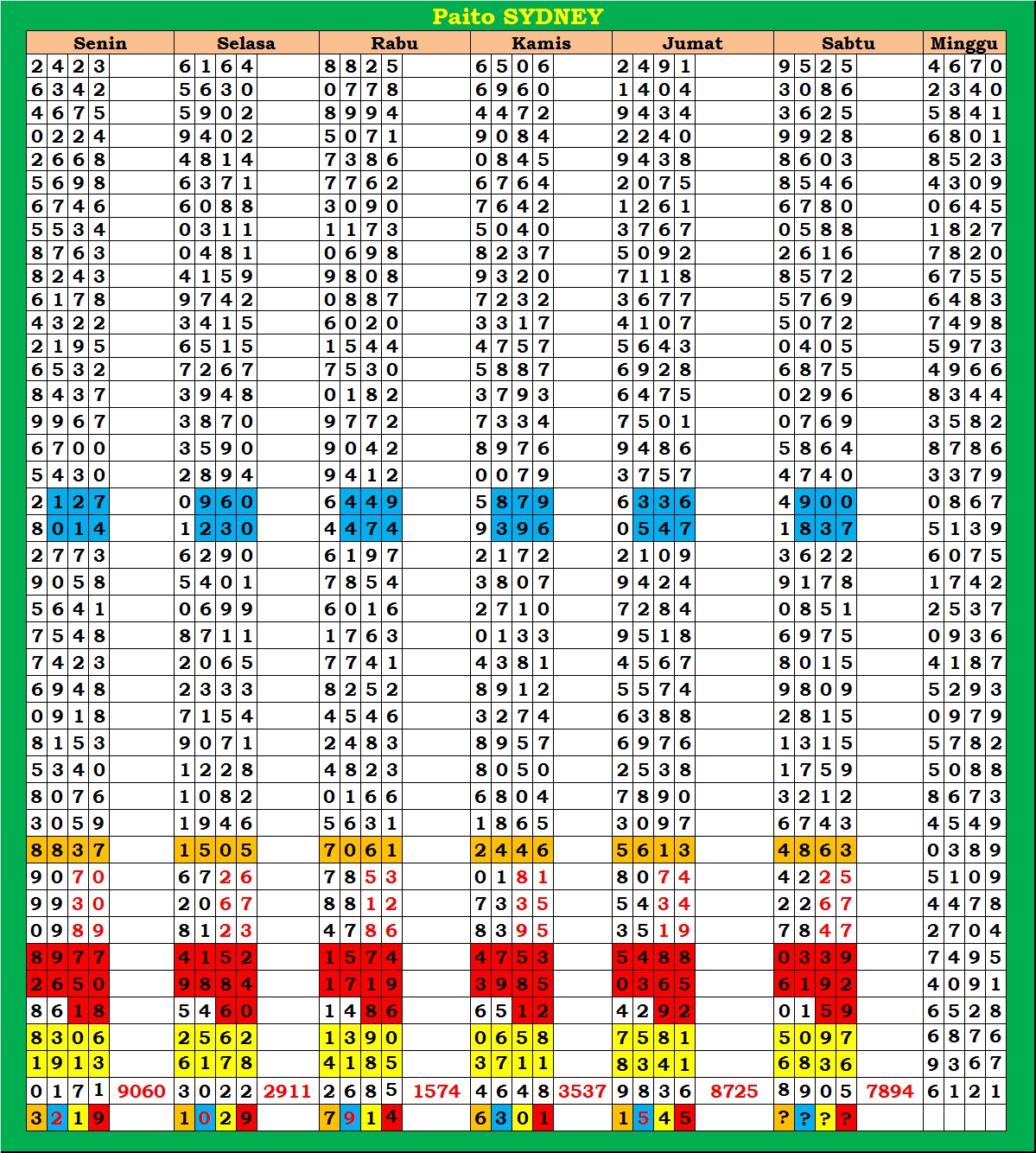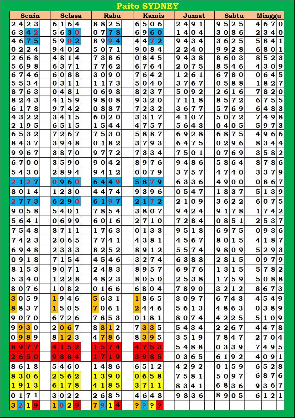 MASTER SYDNEY Minggu, 07-12-2025 Merupakan Prediksi Otomatis yang menggabungkan Metode Kalender Togel Dengan Rumus-rumus kontrol yang sudah terbukti keakuratanya.Gunakan Aplikasi Rekap untuk mendapatkan LN TOP. Harap Maklum Jika kadang meleset MASTER SYDNEY kita. Jadikan ini sebagai perbandingan saja dan tetap UPS