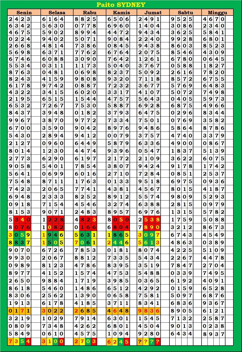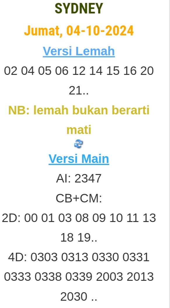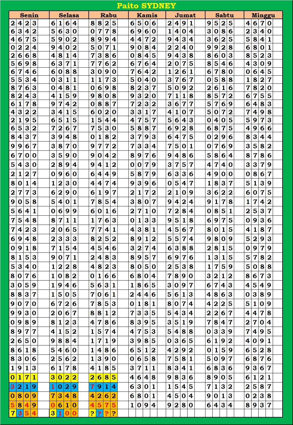 MASTER SYDNEY Minggu, 07-12-2025 Merupakan Prediksi Otomatis yang menggabungkan Metode Kalender Togel Dengan Rumus-rumus kontrol yang sudah terbukti keakuratanya.Gunakan Aplikasi Rekap untuk mendapatkan LN TOP. Harap Maklum Jika kadang meleset MASTER SYDNEY kita. Jadikan ini sebagai perbandingan saja dan tetap UPS