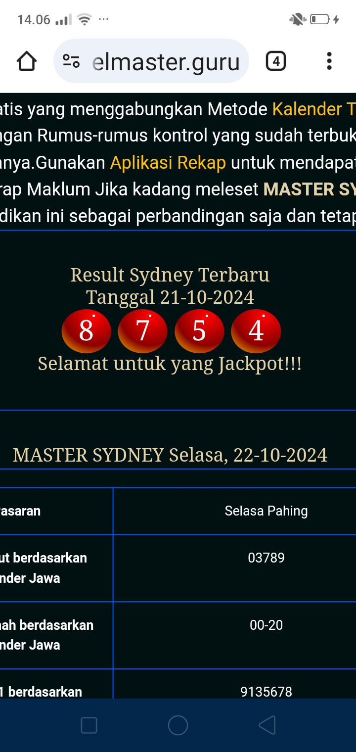 MASTER SYDNEY Minggu, 07-12-2025 Merupakan Prediksi Otomatis yang menggabungkan Metode Kalender Togel Dengan Rumus-rumus kontrol yang sudah terbukti keakuratanya.Gunakan Aplikasi Rekap untuk mendapatkan LN TOP. Harap Maklum Jika kadang meleset MASTER SYDNEY kita. Jadikan ini sebagai perbandingan saja dan tetap UPS