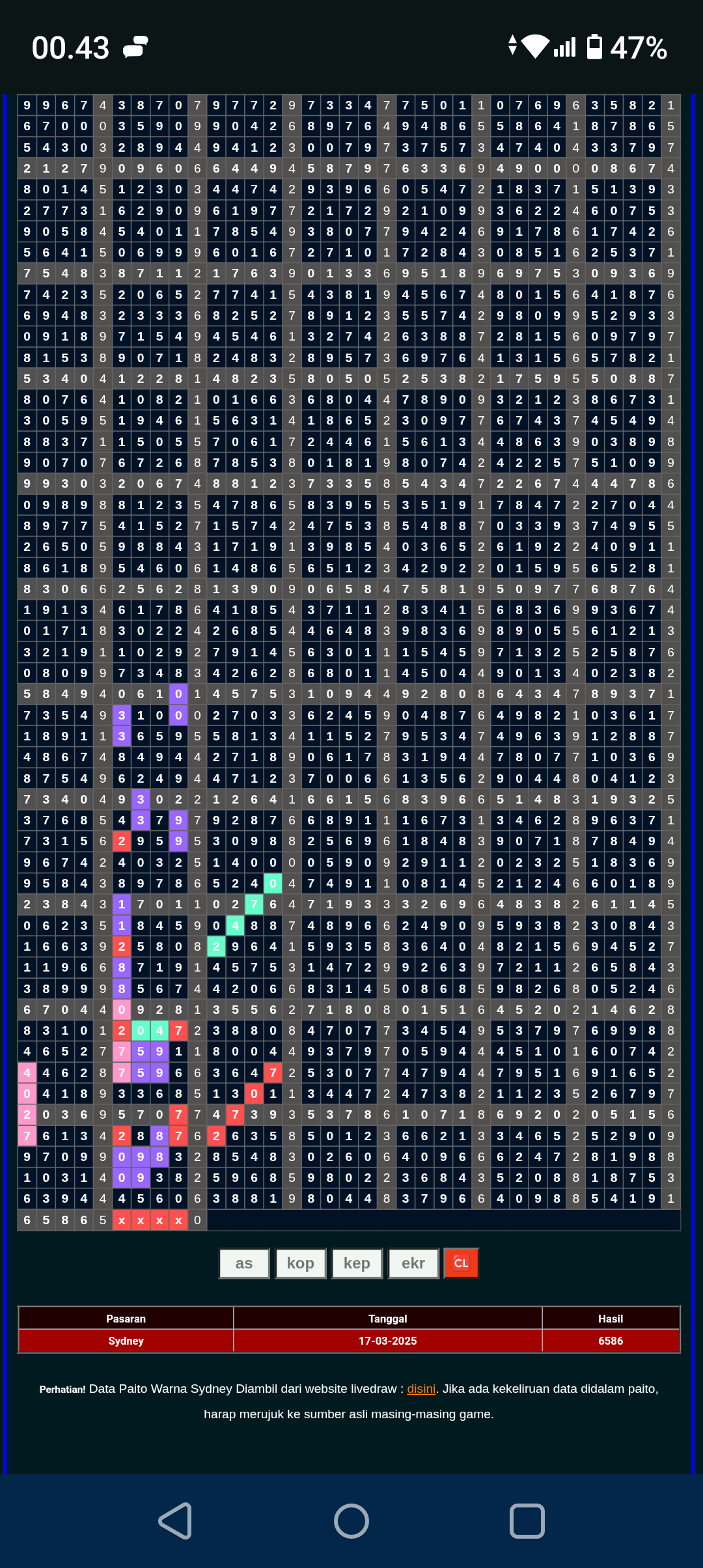 MASTER SYDNEY Minggu, 07-12-2025 Merupakan Prediksi Otomatis yang menggabungkan Metode Kalender Togel Dengan Rumus-rumus kontrol yang sudah terbukti keakuratanya.Gunakan Aplikasi Rekap untuk mendapatkan LN TOP. Harap Maklum Jika kadang meleset MASTER SYDNEY kita. Jadikan ini sebagai perbandingan saja dan tetap UPS