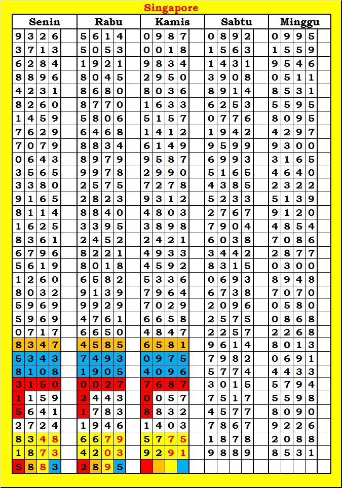 MASTER SINGAPURA Senin, 22-12-2025 Merupakan Prediksi Otomatis yang menggabungkan Metode Kalender Togel Dengan Rumus-rumus kontrol yang sudah terbukti keakuratanya.Gunakan Aplikasi Rekap untuk mendapatkan LN TOP. Harap Maklum Jika kadang meleset MASTER SINGAPURA kita. Jadikan ini sebagai perbandingan saja dan tetap UPS