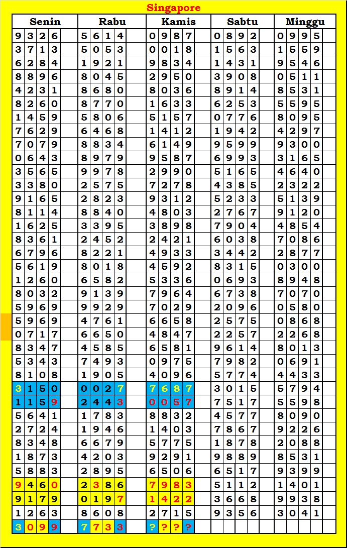 MASTER SINGAPURA Minggu, 07-12-2025 Merupakan Prediksi Otomatis yang menggabungkan Metode Kalender Togel Dengan Rumus-rumus kontrol yang sudah terbukti keakuratanya.Gunakan Aplikasi Rekap untuk mendapatkan LN TOP. Harap Maklum Jika kadang meleset MASTER SINGAPURA kita. Jadikan ini sebagai perbandingan saja dan tetap UPS