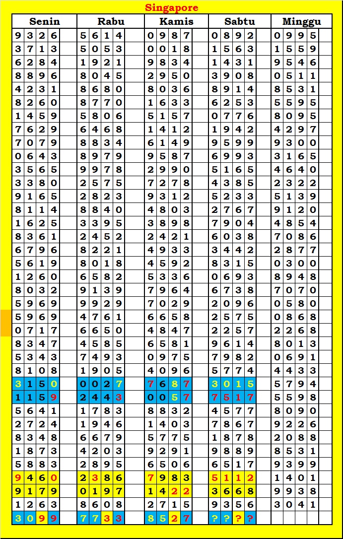 MASTER SINGAPURA Sabtu, 06-12-2025 Merupakan Prediksi Otomatis yang menggabungkan Metode Kalender Togel Dengan Rumus-rumus kontrol yang sudah terbukti keakuratanya.Gunakan Aplikasi Rekap untuk mendapatkan LN TOP. Harap Maklum Jika kadang meleset MASTER SINGAPURA kita. Jadikan ini sebagai perbandingan saja dan tetap UPS
