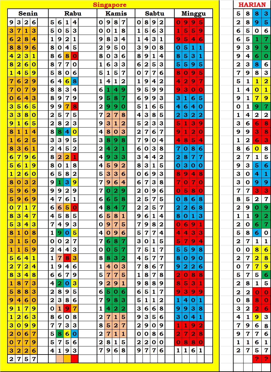 MASTER SINGAPURA Sabtu, 06-12-2025 Merupakan Prediksi Otomatis yang menggabungkan Metode Kalender Togel Dengan Rumus-rumus kontrol yang sudah terbukti keakuratanya.Gunakan Aplikasi Rekap untuk mendapatkan LN TOP. Harap Maklum Jika kadang meleset MASTER SINGAPURA kita. Jadikan ini sebagai perbandingan saja dan tetap UPS