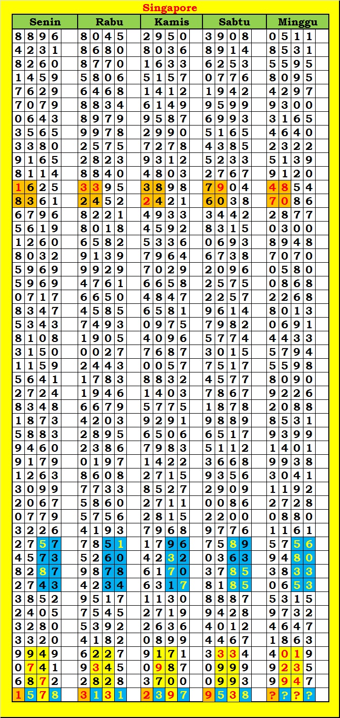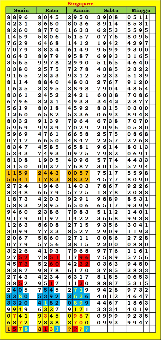 MASTER SINGAPURA Sabtu, 29-11-2025 Merupakan Prediksi Otomatis yang menggabungkan Metode Kalender Togel Dengan Rumus-rumus kontrol yang sudah terbukti keakuratanya.Gunakan Aplikasi Rekap untuk mendapatkan LN TOP. Harap Maklum Jika kadang meleset MASTER SINGAPURA kita. Jadikan ini sebagai perbandingan saja dan tetap UPS