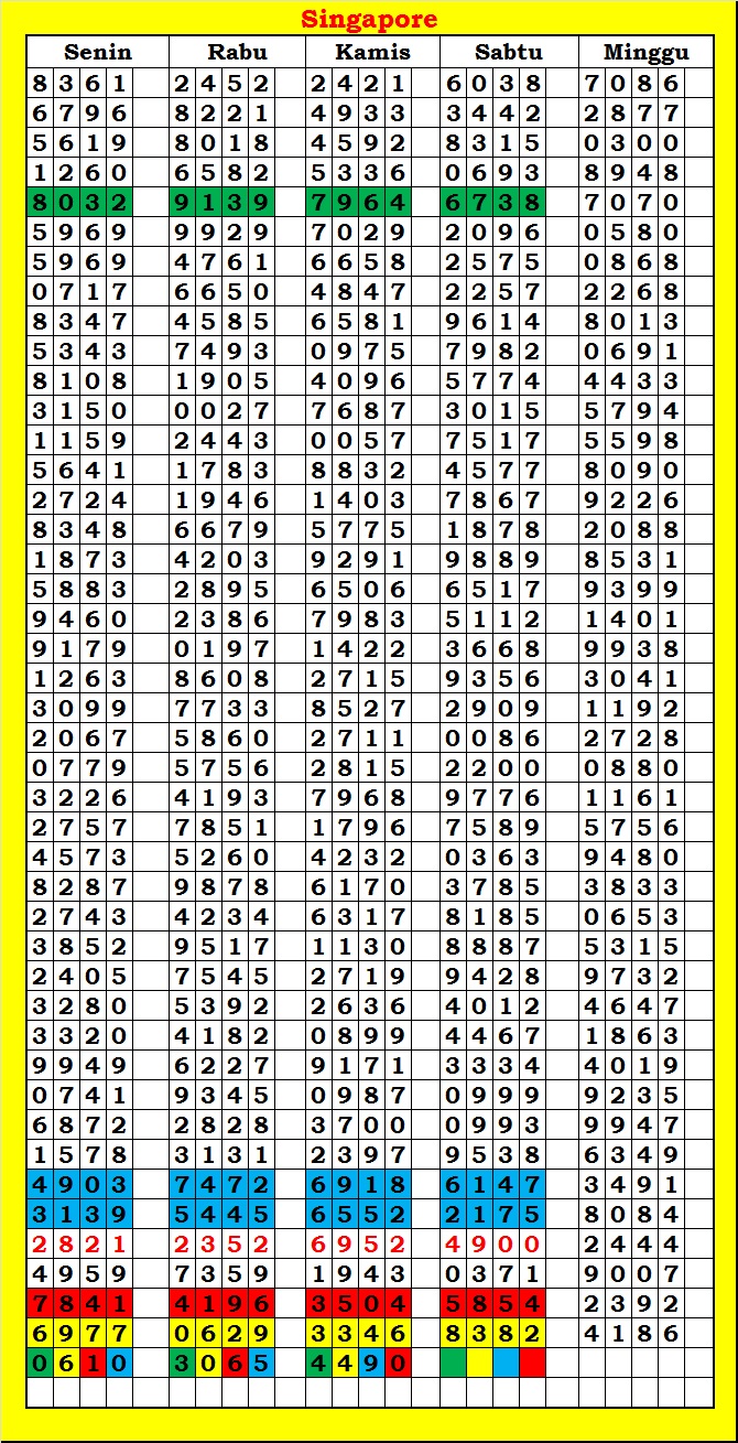 MASTER SINGAPURA Sabtu, 29-11-2025 Merupakan Prediksi Otomatis yang menggabungkan Metode Kalender Togel Dengan Rumus-rumus kontrol yang sudah terbukti keakuratanya.Gunakan Aplikasi Rekap untuk mendapatkan LN TOP. Harap Maklum Jika kadang meleset MASTER SINGAPURA kita. Jadikan ini sebagai perbandingan saja dan tetap UPS