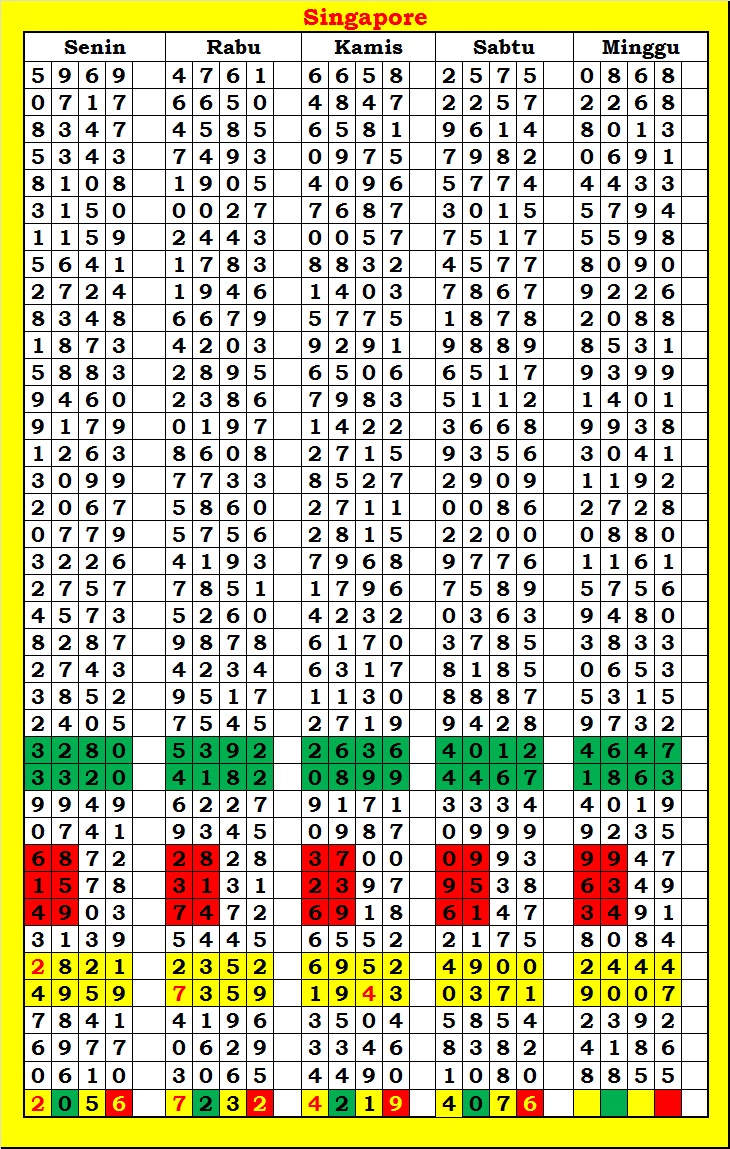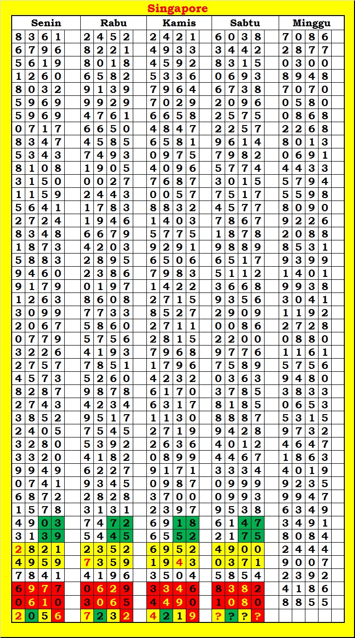 MASTER SINGAPURA Kamis, 27-11-2025 Merupakan Prediksi Otomatis yang menggabungkan Metode Kalender Togel Dengan Rumus-rumus kontrol yang sudah terbukti keakuratanya.Gunakan Aplikasi Rekap untuk mendapatkan LN TOP. Harap Maklum Jika kadang meleset MASTER SINGAPURA kita. Jadikan ini sebagai perbandingan saja dan tetap UPS