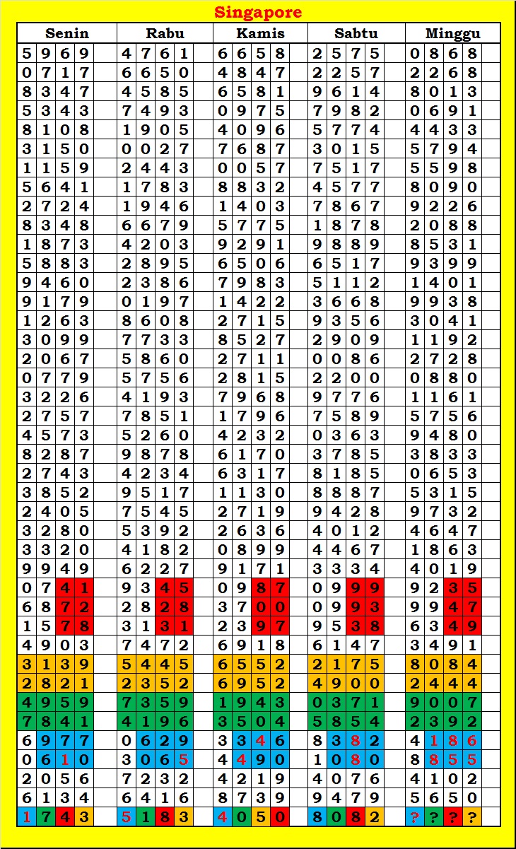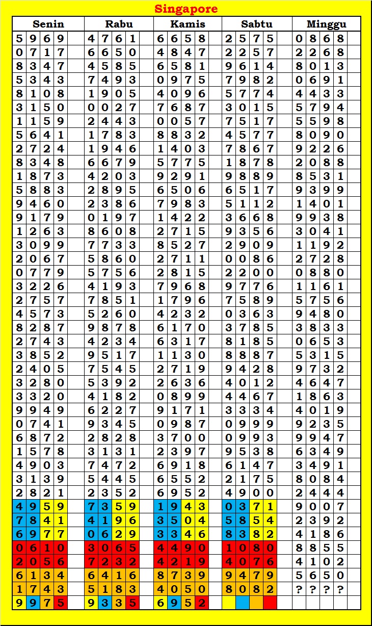 MASTER SINGAPURA Rabu, 26-11-2025 Merupakan Prediksi Otomatis yang menggabungkan Metode Kalender Togel Dengan Rumus-rumus kontrol yang sudah terbukti keakuratanya.Gunakan Aplikasi Rekap untuk mendapatkan LN TOP. Harap Maklum Jika kadang meleset MASTER SINGAPURA kita. Jadikan ini sebagai perbandingan saja dan tetap UPS