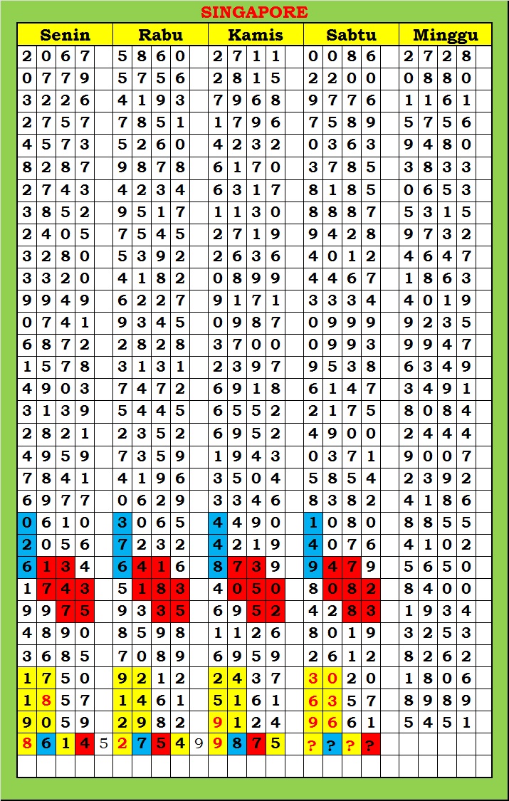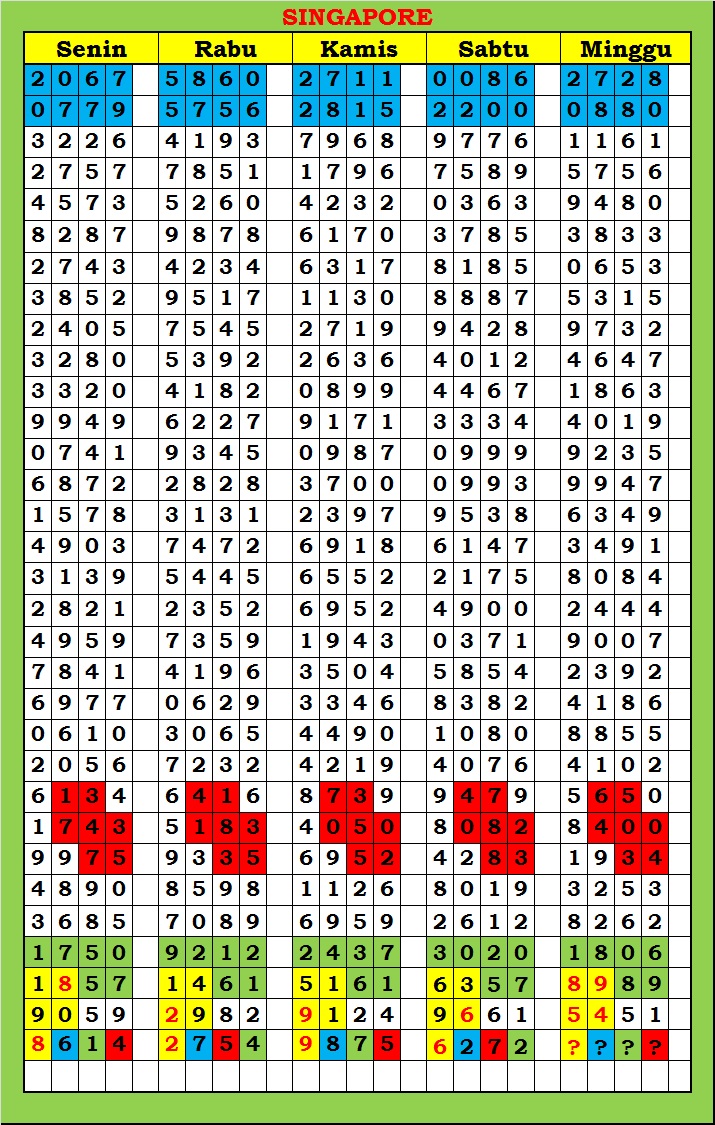 MASTER SINGAPURA Rabu, 26-11-2025 Merupakan Prediksi Otomatis yang menggabungkan Metode Kalender Togel Dengan Rumus-rumus kontrol yang sudah terbukti keakuratanya.Gunakan Aplikasi Rekap untuk mendapatkan LN TOP. Harap Maklum Jika kadang meleset MASTER SINGAPURA kita. Jadikan ini sebagai perbandingan saja dan tetap UPS