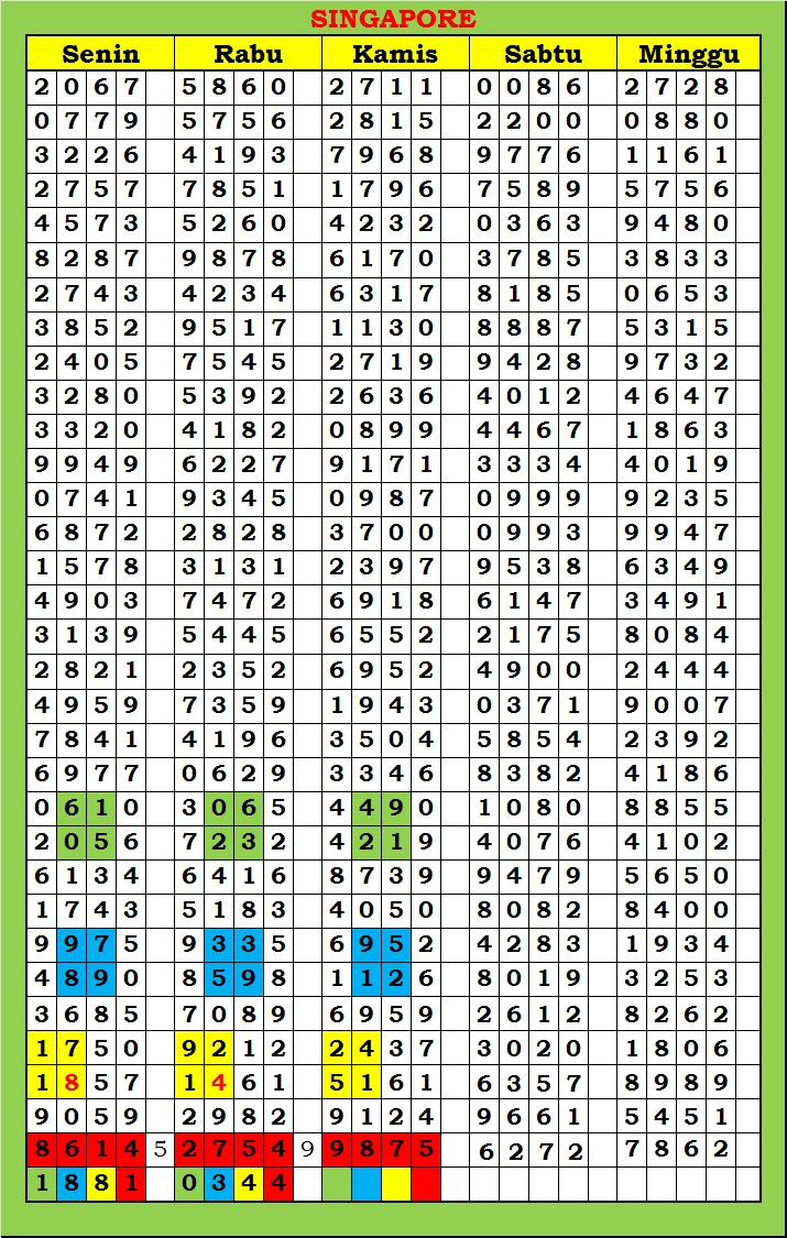 MASTER SINGAPURA Rabu, 26-11-2025 Merupakan Prediksi Otomatis yang menggabungkan Metode Kalender Togel Dengan Rumus-rumus kontrol yang sudah terbukti keakuratanya.Gunakan Aplikasi Rekap untuk mendapatkan LN TOP. Harap Maklum Jika kadang meleset MASTER SINGAPURA kita. Jadikan ini sebagai perbandingan saja dan tetap UPS