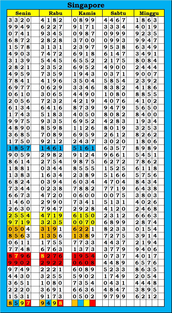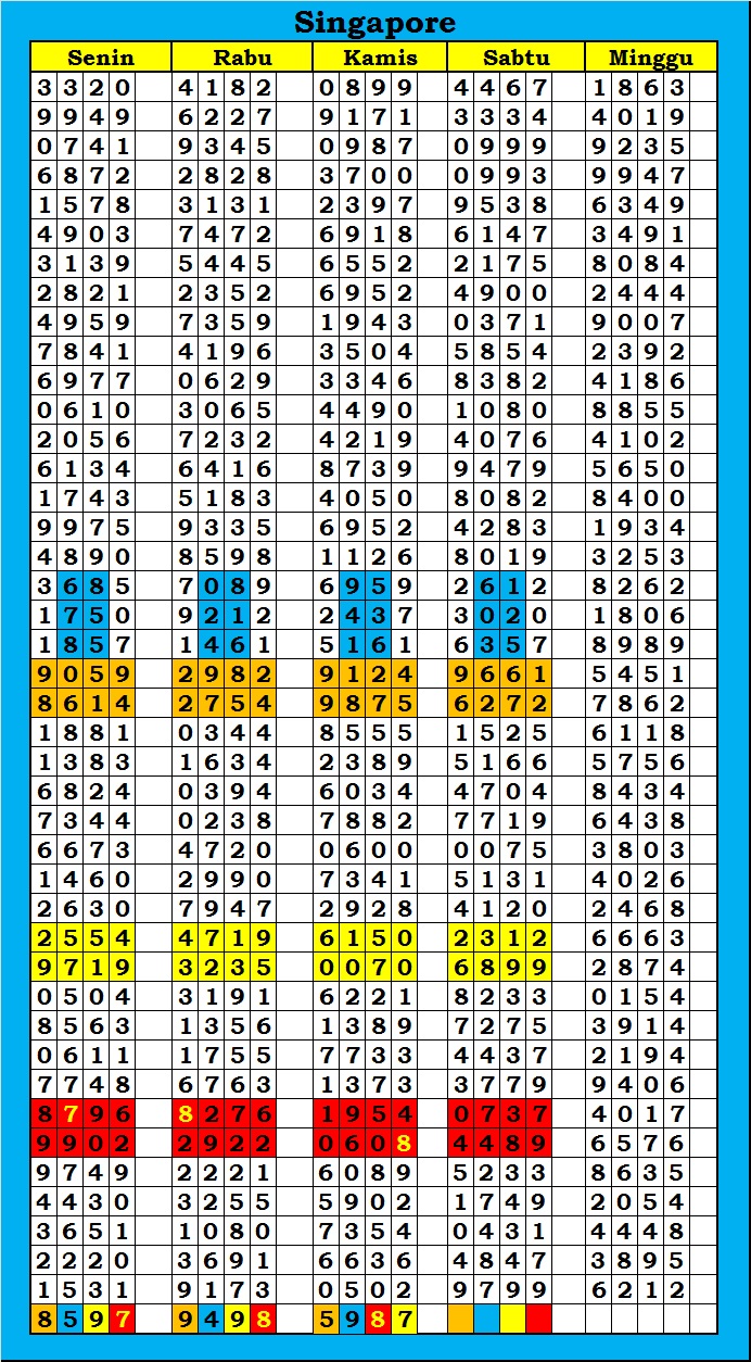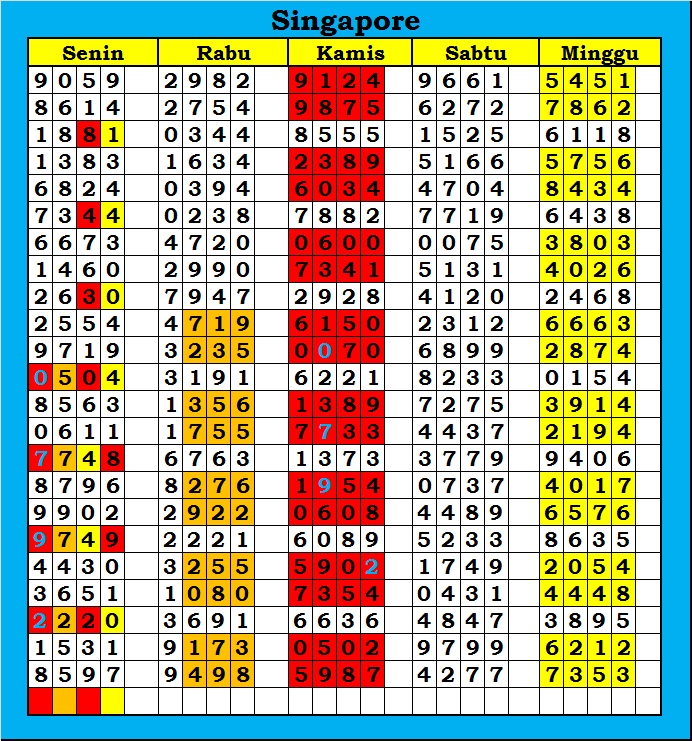 MASTER SINGAPURA Minggu, 07-12-2025 Merupakan Prediksi Otomatis yang menggabungkan Metode Kalender Togel Dengan Rumus-rumus kontrol yang sudah terbukti keakuratanya.Gunakan Aplikasi Rekap untuk mendapatkan LN TOP. Harap Maklum Jika kadang meleset MASTER SINGAPURA kita. Jadikan ini sebagai perbandingan saja dan tetap UPS