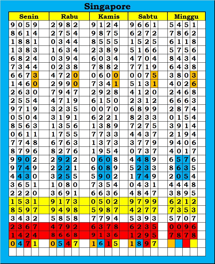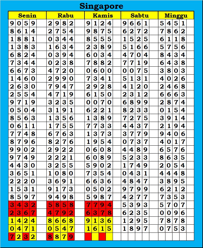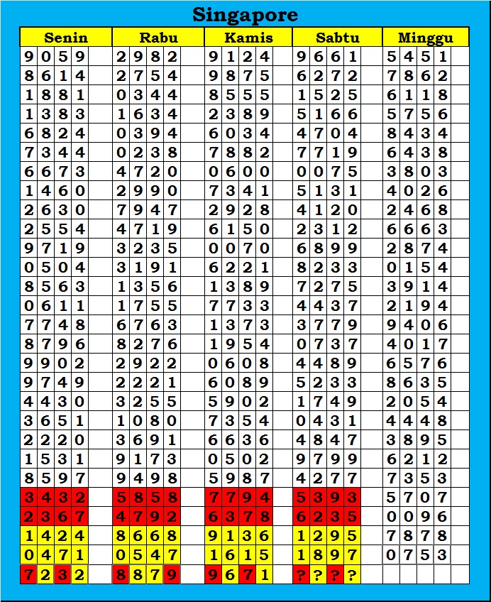 MASTER SINGAPURA Minggu, 07-12-2025 Merupakan Prediksi Otomatis yang menggabungkan Metode Kalender Togel Dengan Rumus-rumus kontrol yang sudah terbukti keakuratanya.Gunakan Aplikasi Rekap untuk mendapatkan LN TOP. Harap Maklum Jika kadang meleset MASTER SINGAPURA kita. Jadikan ini sebagai perbandingan saja dan tetap UPS