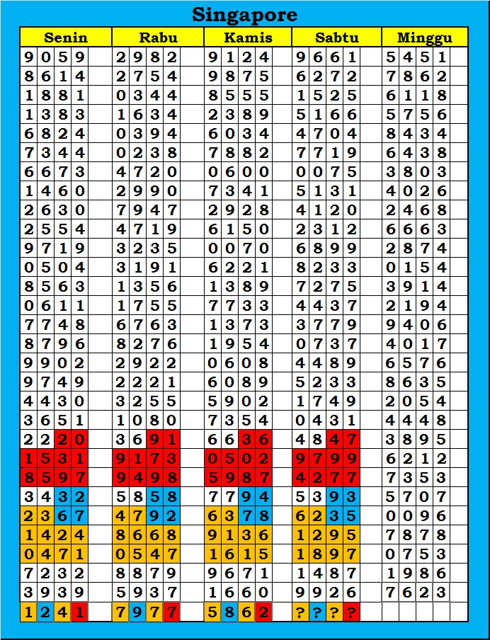 MASTER SINGAPURA Minggu, 07-12-2025 Merupakan Prediksi Otomatis yang menggabungkan Metode Kalender Togel Dengan Rumus-rumus kontrol yang sudah terbukti keakuratanya.Gunakan Aplikasi Rekap untuk mendapatkan LN TOP. Harap Maklum Jika kadang meleset MASTER SINGAPURA kita. Jadikan ini sebagai perbandingan saja dan tetap UPS