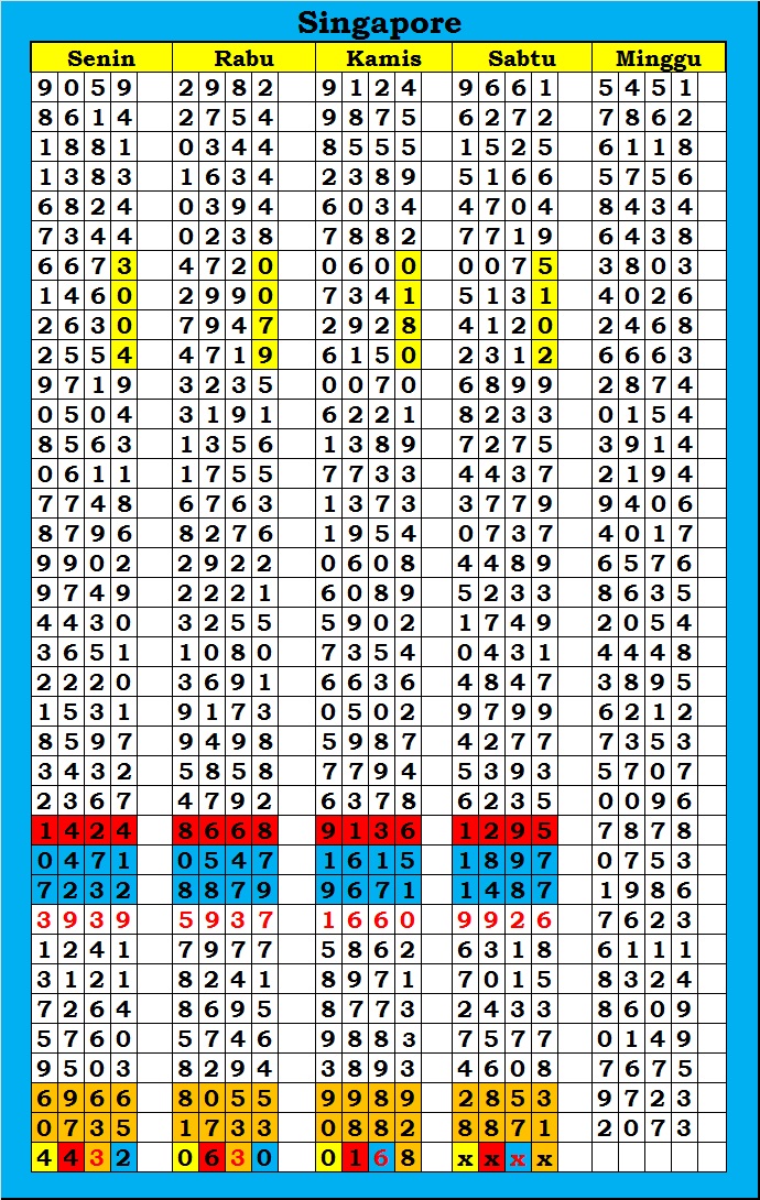 MASTER SINGAPURA Minggu, 07-12-2025 Merupakan Prediksi Otomatis yang menggabungkan Metode Kalender Togel Dengan Rumus-rumus kontrol yang sudah terbukti keakuratanya.Gunakan Aplikasi Rekap untuk mendapatkan LN TOP. Harap Maklum Jika kadang meleset MASTER SINGAPURA kita. Jadikan ini sebagai perbandingan saja dan tetap UPS