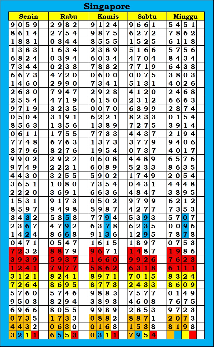 MASTER SINGAPURA Minggu, 07-12-2025 Merupakan Prediksi Otomatis yang menggabungkan Metode Kalender Togel Dengan Rumus-rumus kontrol yang sudah terbukti keakuratanya.Gunakan Aplikasi Rekap untuk mendapatkan LN TOP. Harap Maklum Jika kadang meleset MASTER SINGAPURA kita. Jadikan ini sebagai perbandingan saja dan tetap UPS